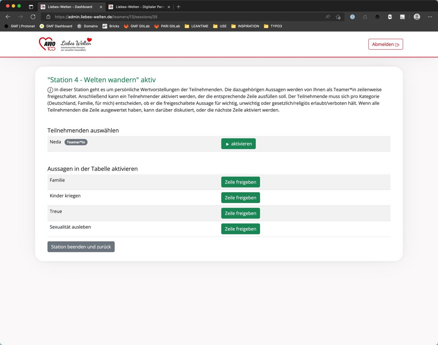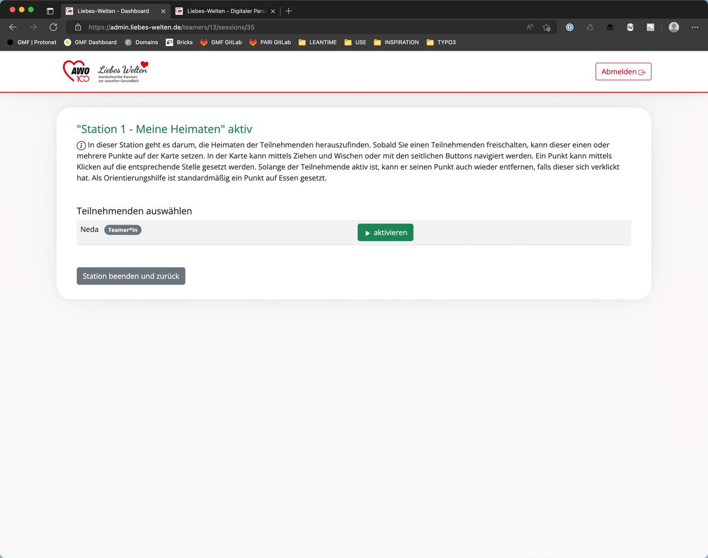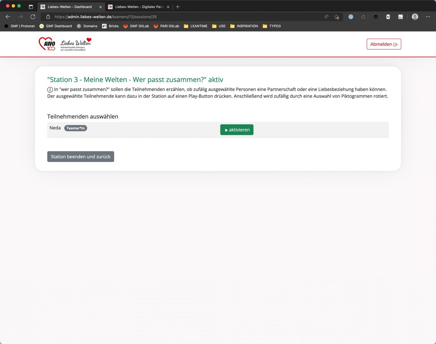 Wenn alle Teilnehmende sich erfolgreich eingeloggt haben, kann der Liebeswelten Parcour losgehen. Um dies zutun muss die jeweilige Station mit einem klick auf den Button "aktivieren" aktiviert werden.