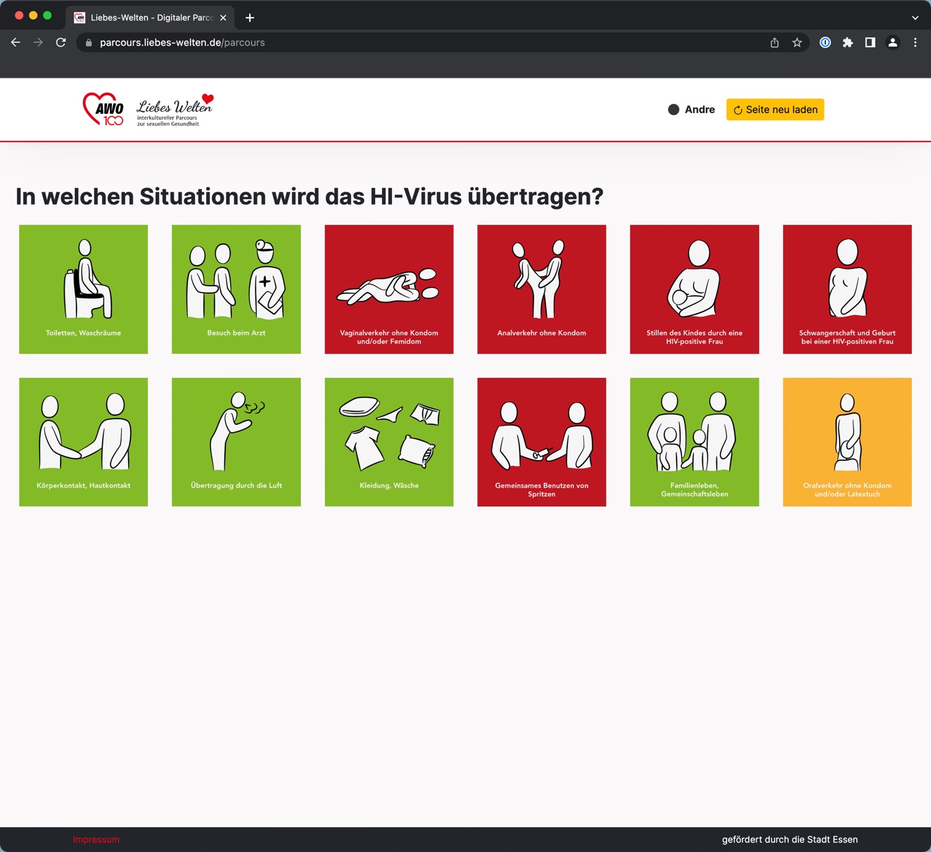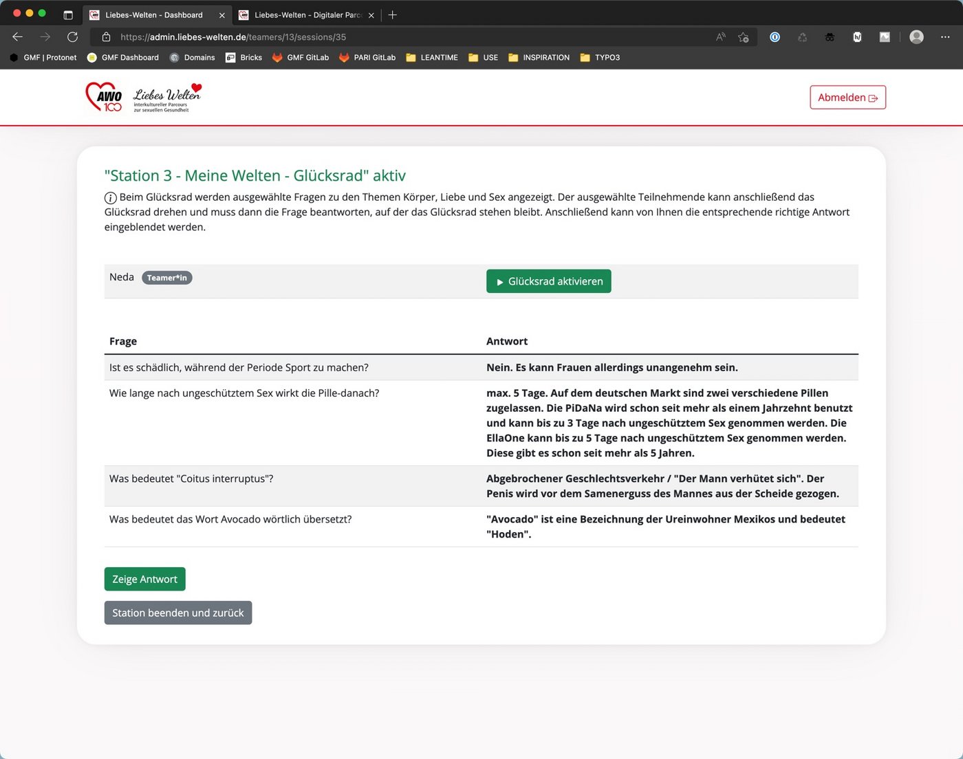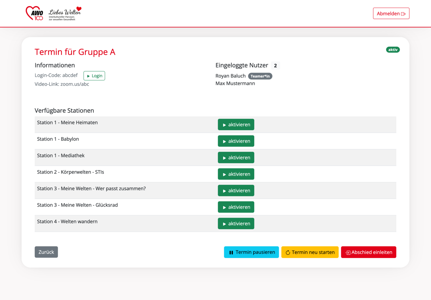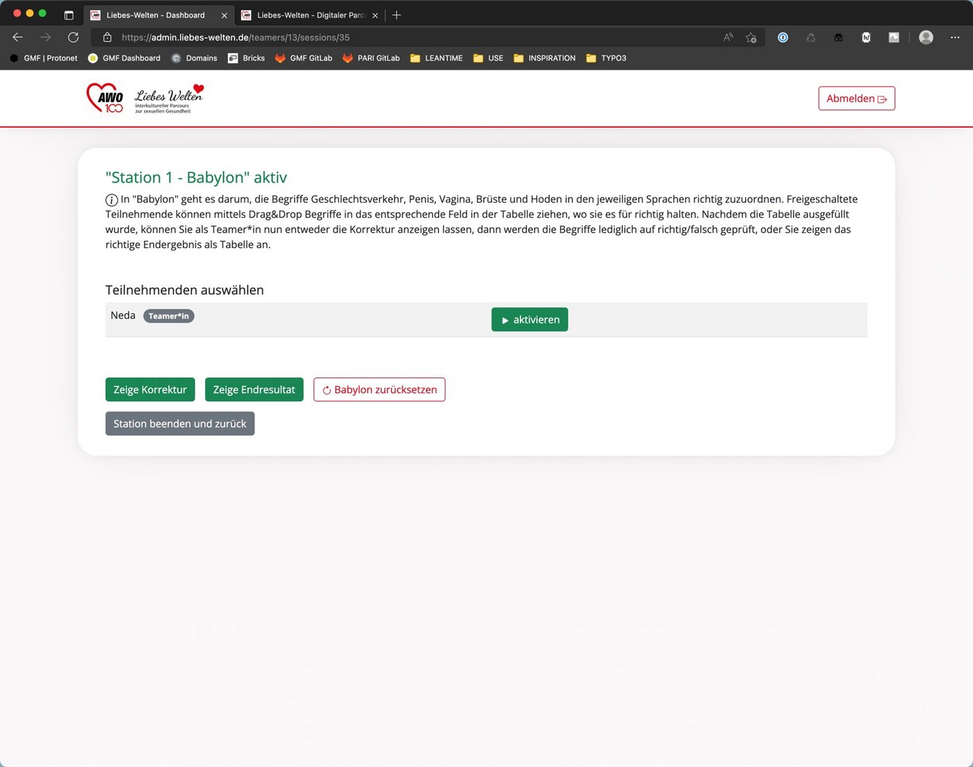 Wenn alle Teilnehmende sich erfolgreich eingeloggt haben, kann der Liebeswelten Parcour losgehen. Um dies zutun muss die jeweilige Station mit einem klick auf den Button "aktivieren" aktiviert werden.