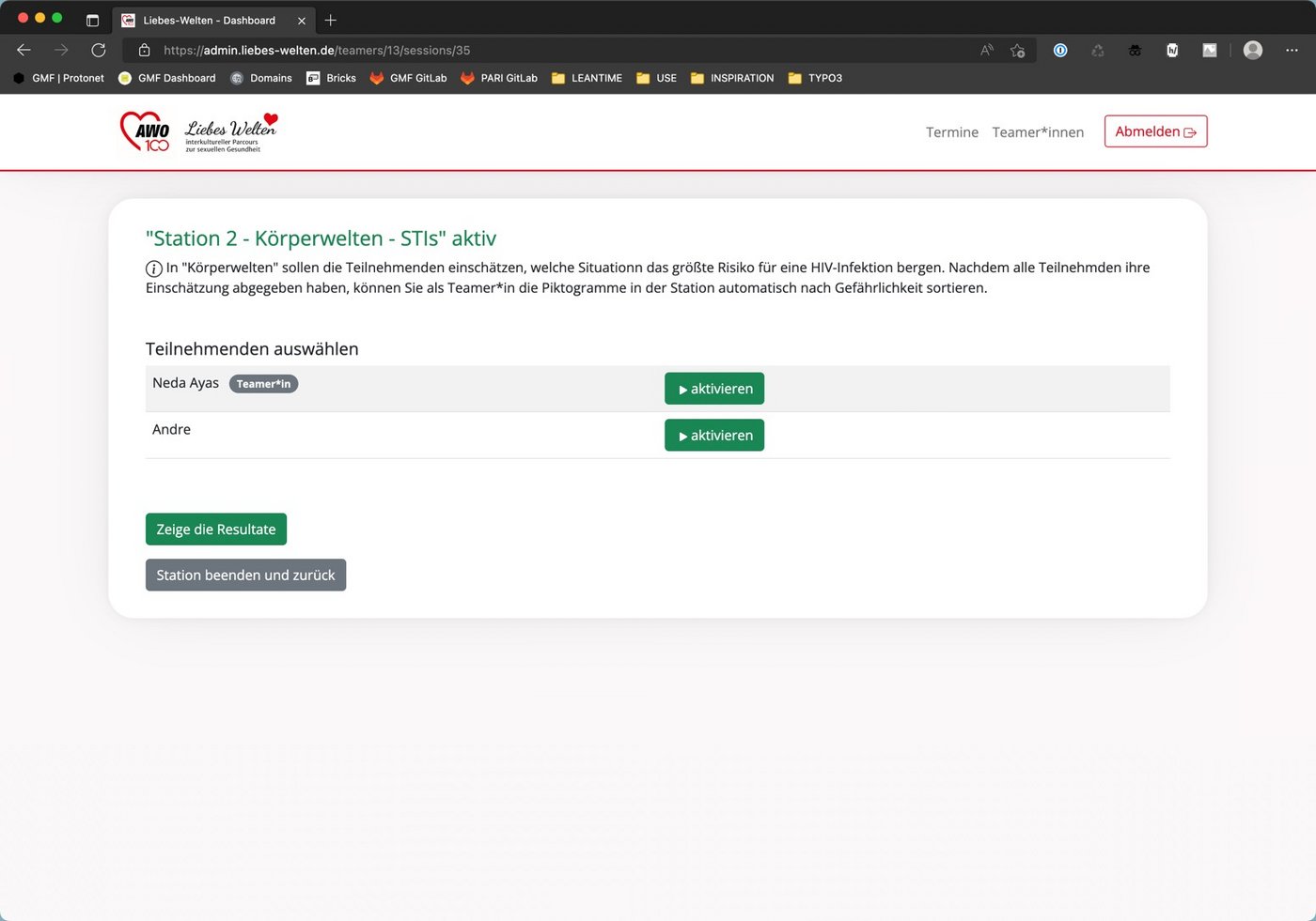 Wenn du den Schritt vollzogen hast, befindest du dich in der Stationsansicht in der du die Teilnehmenden, sowie dich selber "aktvieren" und "deaktivieren" kannst.