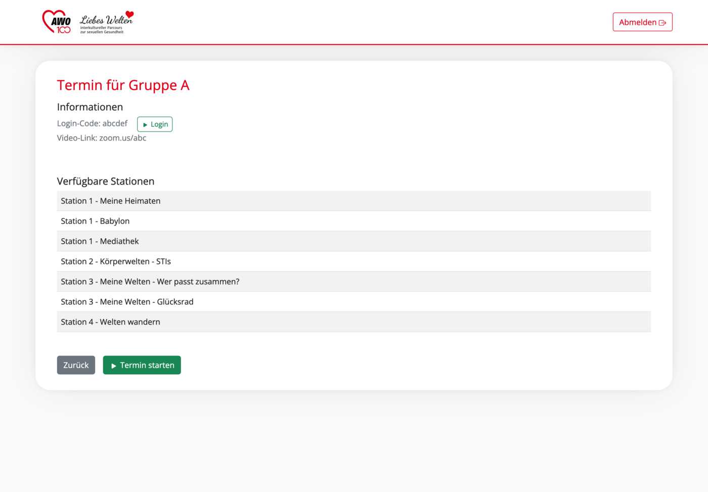 Dieser Termin wurde noch nicht für Teilnehmende freigeschaltet. Um ihn zu aktivieren, klick bitte unten auf den Button "Termin starten". Des Weiteren hast du die Möglichkeit, als Teamer*in aktiv am Parcours teilzunehmen. Drücke bitte dazu auf den Button "Login" rechts neben dem Login-Code. Duann wirst du automatisch zu https://parcours.liebes-welten.de weitergeleitet und der Code wird in das Login-Feld eingetragen.