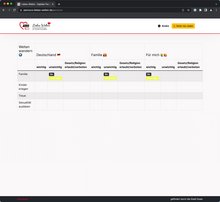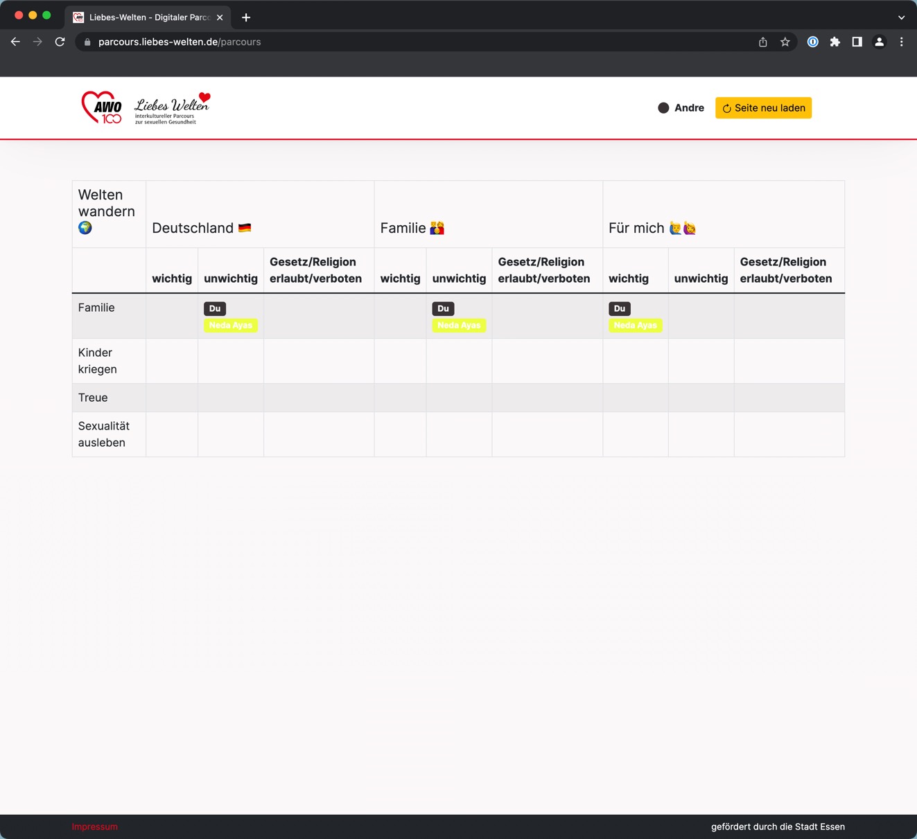 Wenn du eine Person aktiviert hast und die jeweilige Zeile "aktiviert" hast, kann die Person nun ihre persönliche Meinung zu den jeweiligen Kategorien angeben. Dies ist möglich, indem der/die Teilnehmende*r auf das "+" klickt, unter entweder "wichtig", "unwichtig" oder "Gesetz/Religion erlaubt/verboten".